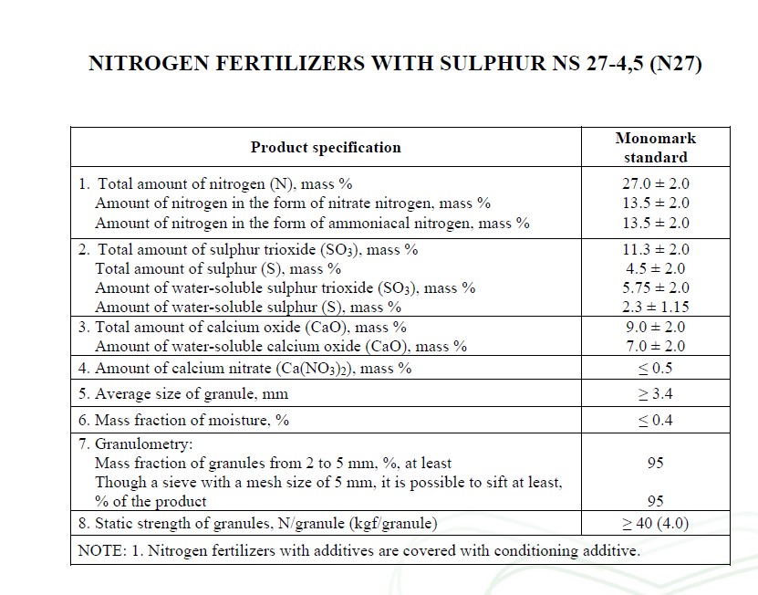 Üldlämmastik (N) – 27 % (ammoniaaklämmastik (N-NH4) – 13,5 % ja nitraatlämmastik (N-NO3) – 13,5 %), väävel (S) – 4,5 %, kaltsium (CaO) – 7,5 %